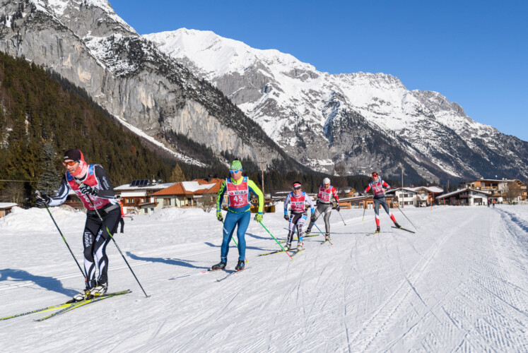 Wo sind denn alle? Ich fragte mich das im Ernst. Nachdem am Tag zuvor über 500 Klassik-Läufer und auf der Kurzdistanz 120 Skater am Start gestanden hatten, war das Feld des 60 Kilometer Skatingrennens mit nur gut 80 Startern tatsächlich überschaubar. Gerade einmal zehn Frauen machte ich in den Startreihen aus. Umso besser, so blieb einem das übliche Hauen und Stechen am Start schon einmal erspart. Bei eisigen minus 9 Grad ging sie los, die lange Jagd. Sigrid Mutscheller, die Favoritin bei den Damen, schlug vom Start weg ein gewohnt hohes Tempo an. Ich versuchte Sichtkontakt zu halten, was die ersten Kilometer gelang. Doch mit dem ersten großen Anstieg hinauf zur Wildmoos Alm siegte die Vernunft. Die Beine gaben recht klar und deutlich Zeichen, dass sie so nicht bereit waren, weitere 55 Kilometer durchzuhalten. Eisige Kälte von außen und übersäuerte Beine im dünnen Rennanzug, Wohlfühlfaktor entsprechend ebenfalls im Minusbereich! Und so fand ich in meinen eigenen Rhythmus, was sich auszahlen sollte. Auf Höhe Lottensee hatte ich den Puls wieder in einen humanen Bereich gebracht und schloss mich einer vierköpfigen Männergruppe an. Durch einen Seefelder Freund war ich vorgewarnt worden: „Pass gut auf nach den zwei Linkskurven auf der Abfahrt hinunter nach Leutasch! Es gibt dort eine extrem eisige Kurve.“ Ja da denke ich doch im Eifer des Gefechts nicht mehr dran! Wie ein Blitz schossen mir seine Worte dann aber doch noch durch den Kopf: Nämlich als die eben erwähnte vierköpfige Männergruppe vor mir zu Boden ging. Ich hätte an dieser Stelle gerne erzählt, wie ich elegant an ihnen vorbeizog. Doch ich will bei der Wahrheit bleiben: Mich hat’s auch hingehauen! Die Herren waren unerschrocken – in den nächsten rasanten Kurven wurde das Tempo keinesfalls gedrosselt. Resigniert beschloss ich, ebenfalls den Kopf auszuschalten und sauste hinterher. Nun ging’s im Vollspeed hinein in die schöne Leutaschregion. Ein Blick auf die Uhr sagte mir, … dass die Zeit stehen geblieben ist. So ist das eben in einem Wintertraum… Schön wär’s. Vermutlich bin ich einfach beim Sturz auf den Pausenknopf gekommen, die Rennzeit lief selbstverständlich unbarmherzig weiter. Aber glücklicherweise gab es die wunderbaren Kilometerangaben entlang der Strecke mit herrlich aufbauenden Sprüchen darauf, wie: „You are a hero!“ Na wer da nicht erhobenen Hauptes die Anstiege hinauf prescht… Überhaupt war das Rennen von A-Z hervorragend organisiert. Ein ganz herzliches Dankeschön an die Organisatoren und die zahlreichen Helfer entlang der Strecke.