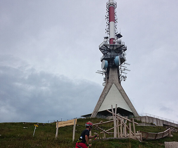 Voller Motivation nehme ich die letzten Kilometer in Angriff. Den Gipfel habe ich dabei immer im Blick. Ab dem Alpenhaus ist die Straße für den öffentlichen Verkehr gesperrt und die Teerdecke hat über die Jahre durch Pistenraupen ganz schön gelitten. Deswegen komme ich nur langsam voran, aber mit dem Ziel vor Augen kämpfe ich mich durch. Es ist mehr Skigang als klassisches Laufen, was ich jetzt betreibe. Das ist aber auch der noch einmal größer gewordenen durchschnittlichen Steigung geschuldet. In der letzten Kehre unterhalb der Bergstation warten dann meine Frau und mein Sohn und feuern mich noch einmal an. Ich laufe an ihnen vorbei und absolviere auch noch die letzten Meter bis zum Fuß des Sendeturms. Irgendwer hat dort mit der Hand eine Ziellinie aufgemalt. Mit deren Überquerung bin ich nach 1:36 Stunden auch an meinem ganz persönlichen Ziel angekommen. Schnell noch ein paar Erinnerungsfotos gemacht und die Klamotten gewechselt, dann geht es auch schon mit der Gondel zurück ins Tal.