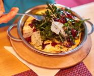 Als ich am Sonntag in aller Frühe für eine kleine Vorfrühstücksrunde die Ski in die frisch gespurte Loipe legte, war ich noch nicht ganz gefasst auf das was folgen würde. Ich laufe gern in der Stille der aufgehenden Sonne. Aber als die ersten Sonnenstrahlen die Spitzen des Dachsteinmassivs berührten, musste ich einfach stehen bleiben und innehalten. Es war einfach magisch. Langsam färbte sich der Schnee auf den Bergen rostrot und kündigte einen wahren Wintertraumtag an. Was für ein Sonnenaufgang! Nach einem kleinen Frühstück und dem Auschecken aus dem Hotel ging es wieder in die Spur. Lieber wäre ich noch länger geblieben aber leider hatte ich es nicht so einfach wie Wolfgang Ambros im Lied Skifoarn: „Und denk‘ ma ‚aber wo‘ I foar‘ no ned z’Haus, I bleib‘ am Montog a no do“. Also die letzten Kilometer im Winterwunderland nochmal ausgiebig genießen! Und das hatte ich vor. Als Belohnung winkte mir ein Mittagessen in der kleinen Sattelberghütte, direkt auf der Sonnenseite der Ramsau mit Blick über Schladming. Was für ein Ausblick! Trotz des Sonnenscheins entschied ich mich dann doch für einen Sitzplatz in der kleinen Hütte. Aber weniger verschwitzt hätte ich den Sonnentag definitiv auf der Terrasse genossen. Das Mediterrane Dachstein-Omelette servierte mir wieder der Chef persönlich. Die kleine Küche lässt nicht viele Mitarbeiter zu, erklärte er mir lachend. Seine Frau und er betreiben die gemütliche, neu eingerichtete Hütte mit wunderbarem Kinderspielplatz im Wald, Naturerlebnispfad und Streichelzoo. Ein absolutes Must See und Must Eat! Der Käse harmonierte perfekt mit den Eiern und dem Rucola, dazu gabs steirisches Kürbiskernöl. Dazu noch nette Gesellschaft und eine wunderbare Aussicht, für mich war es der perfekte Abschluss eines kulinarisch sportlichen Wochenendes!