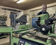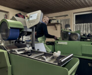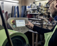 Nun ist mein erstes Paar Ski dran. Franz wählt das Schliffprogramm P52 am Touchscreen aus. P steht für Pfeilschliff und die Nummer 52 ist aus seiner Erfahrung heraus am besten für Temperaturen zwischen -2 und -10 Grad geeignet. „Natürlich wäre auch ein speziellerer Schliff möglich, der nur in einem Temperaturbereich von drei Grad funktioniert. Aber um dann alle Schneebedingungen und Temperaturbereiche abzudecken, bräuchte man mehr als zehn Paar Ski. Für den normalen Skilangläufer eignen sich universellere Schliffe viel besser.“ Das hält ihn natürlich nicht davon ab, Spezialschliffe auszuprobieren und für den Einsatz auf Rennskiern von Profis vorzubereiten. Nicht umsonst haben die Ex-Weltcupathleten Johannes Bredl und Josef Wenzl auf das Wissen von „Frando“ vertraut. Inzwischen hat der Diamant im Bauch der Maschine die Schleifstruktur auf den Schleifstein aufgebracht. Der Stein kann bei Wintersteiger Maschinen wie der RS 150 zweigeteilt genutzt werden. Mit der einen Hälfte wird so der Vorschliff gemacht, mit der anderen der Feinschliff. Effizienz ist hier bares Geld wert, denn Diamant und Stein nutzen sich mit der Zeit ab und müssen ersetzt werden.