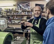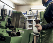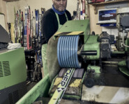 Wir haben drei Paar Ski mit dabei, die unterschiedlich lang in Gebrauch sind und auch unterschiedliche Bauweisen haben. Zunächst gilt es deshalb, den idealen Einsatzbereich festzulegen. Schließlich bringt es nichts, einen eher weichen Ski mit einem Schliff zu versehen, der nur bei kalten Temperaturen und vereister Strecke funktioniert. Mit seinem geprüften Blick hat der Sporthändler aus Außenried das schnell ermittelt. Bevor er sich aber an die Aufbringung des Rennschliffs macht, muss der Ski erstmal plan geschliffen werden. Das macht Franz mit seiner alten Schleifmaschine. Mehrmals lässt er meinen ältesten Ski über den Schleifstein ziehen, bis er mit dem Ergebnis zufrieden ist. Über die Jahre hat sich der Belag durch das Bearbeiten etwas gewölbt und lag deshalb nicht mehr plan auf dem Schnee auf. „Das ist aber insbesondere bei kalten Bedingungen enorm wichtig, um einen möglichst breiten Wasserfilm zu erzeugen, auf dem der Ski schneller gleiten kann“, weiß unser Schleifer.