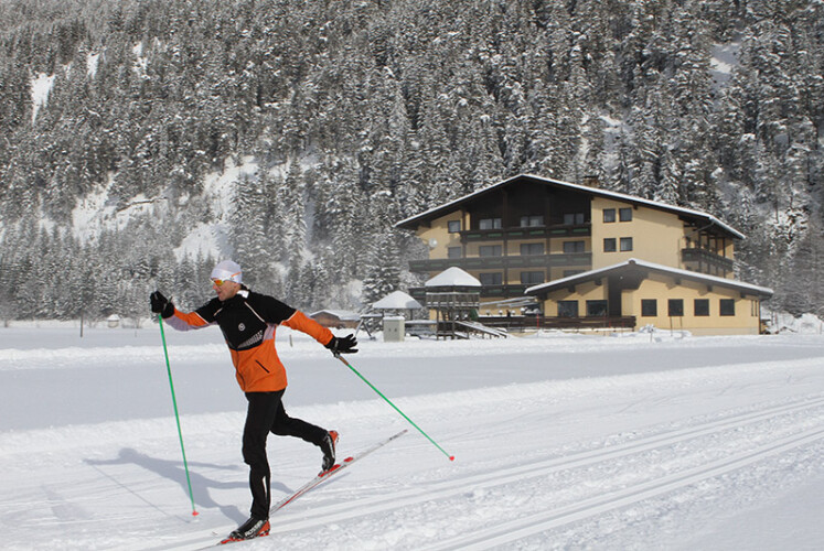Am nächsten Morgen stärke ich mich am reichhaltigen Frühstücksbuffet und während ich noch meine letzte Semmel vertilge, begrüßt mich auch schon Rainer. Er ist passionierter Langläufer, bei Skimarathons am Start und für Fortgeschrittene sowie ambitionierte Langläufer der ideale Langlauflehrer beziehungsweise Trainer. Er nimmt mich heute mit auf die längste Tour hier, die Lechtal-Loipe. Sie startet in Steeg, etwas westlich von Schönau und führt am Hotel vorbei bis ins etwas mehr als 40 Kilometer entfernte Forchach. Für die Anfahrt nach Steeg nutzen wir den kostenlosen Skibus und auch am Loipeneinstieg am Ortsrand von Steeg will man keine Loipengebühr von uns kassieren. Die Benutzung ist gratis. Die Streckenführung ist nun denkbar einfach. Wir folgen dem Lech flussabwärts, was uns bis zum Ziel einige Meter an negativem Höhenunterschied einbringen wird. So lässt sich bequem Tempo machen, ohne dass es übermäßig Kraft kostet. Immer wieder überqueren wir den Flusslauf auf wunderschönen Holzbrücken, die uns einen Blick in Fließrichtung erlauben. Als wir am Hotel vorbeilaufen winkt uns Elke zu, aber es ist noch zu früh für eine Pause. Weiter geht es durch Bach und vorbei an Elbigenalp und Häselgehr bis nach Elmen, Stanzach und Forchach. Es läuft so schön und schnell, dass wir ganz vergessen, irgendwo zur Brotzeit einzukehren. Am Ziel angekommen besteigen wir den Skibus, der uns an der Haltestelle vor meinem Hotel absetzt.