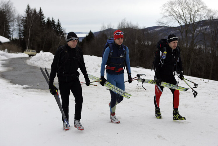 In der Nacht vor dem Start schlief ich unruhig. Zwar wusste ich die genauen Längen der einzelnen Tagesabschnitte (43km, 69km, 47km), Höhenangaben gab es jedoch nicht. Zudem wurde es langsam wärmer und der Schnee in den Tagen vor dem Aufbruch nasser. Das sollte noch größeren Einfluss auf unsere Laufzeiten haben. Als Begleiter hatten sich Michael, ein erfolgreicher Nachwuchssportler aus der Region, und Horst, ein aktiver Volksläufer, gefunden. Gemeinsam fuhren wir im Begleitfahrzeug nach Hudlach, einer Drei-Häusersiedlung oberhalb von Hohenwarth. Hier schnallten wir die Skier an und machten uns auf den 43 Kilometer langen Weg nach Seebachschleife, dem ersten Etappenziel. Schnell wurde klar, dass ich meine beiden Mitläufer würde einbremsen müssen, um nicht vorzeitig k.o. zu gehen. Das Laufen mit Rucksack ist dann doch etwas anderes, als das normale alltägliche Training. Nach sechs Kilometern und den ersten Höhenmetern erreichten wir Eck, eine Art Pass im Höhenzug zwischen Kaitersberg und Arber.