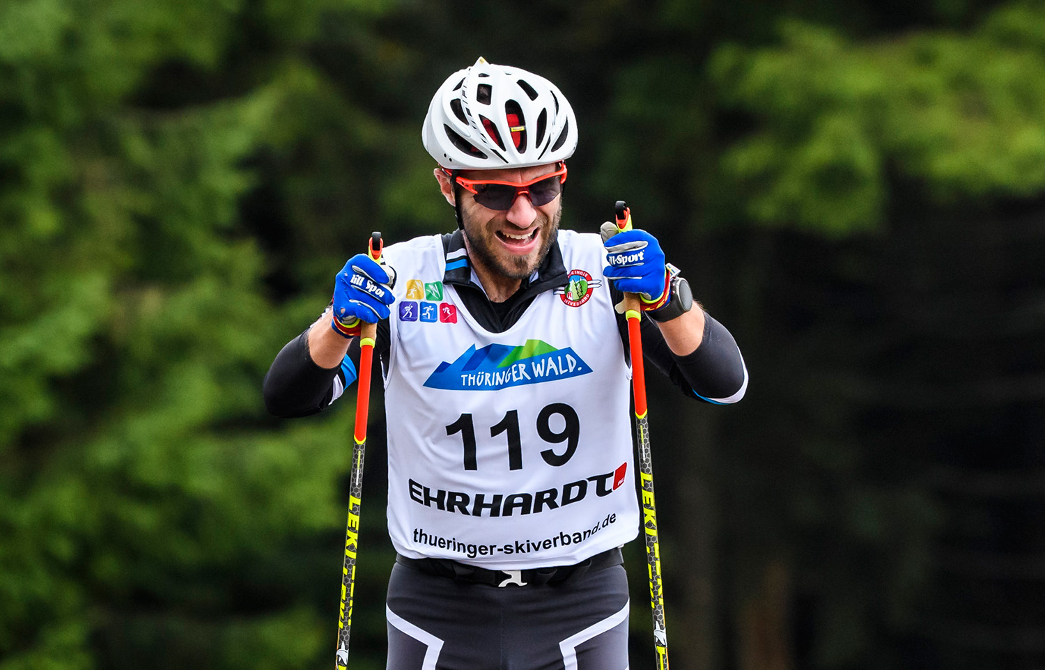 Dann lasse ich Oberhof hinter mir und mache mich auf die letzten Kilometer in Richtung Grenzadler. Unzählige Male bin ich diesen Abschnitt schon mit dem Auto abgefahren, auf Skirollern dagegen erst einmal bei der Streckenbesichtigung am Tag zuvor. Vor mir entdecke ich weitere Teilnehmer und ich gebe noch einmal alles, um noch ein paar Plätze gut zu machen. Über den großen Parkplatz oberhalb des Biathlonstadions geht es schließlich auf die alte Rollerbahn am Grenzadler und der letzte Kilometer wird eingeläutet. Ich muss noch einmal Gas geben, um den gerade überholten Konkurrenten auf Distanz zu halten. Ich habe aber tatsächlich noch ein paar Körner übrig, um den letzten Anstieg „hochzuspringen“. Dann nähere ich mich der Ziellinie und überquere diese nach 21 Kilometern, etwas mehr als 530 Höhenmetern und einer Zeit von 1:31:50 Stunden.