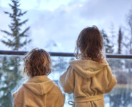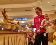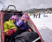 Zurück im Stadion ist noch Zeit für eine kleine Trainingsrunde. Also zücken wir nochmal unsere Seefeld Card, die uns nicht nur die Pistenbullifahrt ermöglich hat, sondern auch den kostenlosen Zutritt zur Loipe. Mittlerweile hat es wieder angefangen zu schneien, aber das tut der Stimmung keinen Abbruch. Den Schuppenski sei dank, müssen wir uns auch keine Gedanken über das Wachs machen. Da wir gerade selbst für die perfekte Spur gesorgt haben, läuft sich’s gleich doppelt so gut. Selbstsicher stolzieren die beiden Ladys mit ihren Ski zur Spur und lassen sich den Schnee aus den Schuhen klopfen. Ja, so manches haben sie sich von den Weltcup-Läufern schon abgeschaut. Während die Kleinste gemütlich in der Bauchtrage vor sich hin schläft, ziehen die anderen ihre Spuren in den Seefelder Schnee, am Ende gezogen von dem immer mitreisenden Kinderskigurt und uns. Doppeltraining für die Eltern, Spaß für die Kinder – was will man mehr. Nun heißt es aber endgültig ab ins Warme, schließlich soll das Team nicht krank werden. Im Hotel wird erst einmal ausgiebig der Wellness-Bereich getestet und für sehr gut befunden, warmes Wasser soll ja hilfreich sein für die Regeneration. Was fehlt jetzt noch zu einem gelungenen Trainingstag? Richtig, Essen. Also auf ins Restaurant. Der nette Kellner kümmert sich gleich noch darum, dass das Team weich sitzt („Mama ich seh den Teller nicht“) bevor das Buffet gestürmt wird. Schließlich will man für den nächsten Tag gut gestärkt sein. Ins Bett fallen die beiden Mädels dann ganz von allein. Von was sie wohl träumen? Der kleinste Floh der Truppe hält auch nicht mehr lange durch und schon bald ist es ruhig im Zimmer. Ein Umstand, der dank der Kleinen nur wenige Stunden anhält. Aber zumindest die beiden Älteren schlafen Gott sei Dank wie zwei Steine.