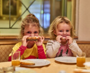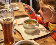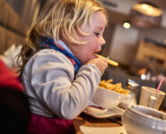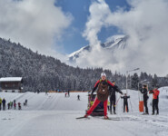 Pünktlich mit dem ersten Sonnenstrahl der hinter den Tiroler Bergen hervor lugt sind die drei Mädels wieder wach. Jetzt kommt auf uns die Aufgabe zu, zwei von drei Frühaufstehern zu erklären, dass es hier noch kein Frühstück gibt. Also auf zur Morgengymnastik – Gruppenkitzeln und kleine Schwester ärgern. Hungrig wie die Wölfe (so scheint es) wird schließlich das Frühstücksbuffet gestürmt. Viel zu viel Auswahl! Da obliegt es den Eltern für die kleinen Sportler das richtige auszuwählen. Nutella, Eier, Wurst, Marmelade… Hauptsache es schmeckt. Frisch gestärkt geht es hinaus auf die Loipe. Die Sonne lacht vom weiß-blauen Seefelder Himmel und auch die Kleinen springen wie Flummis über den frischen Neuschnee. Schnell erobern sie sich in dem Getümmel der Skischulen und Trainingsgruppen ihre Loipe: Vorsicht jetzt kommen wir! Das haben sie schon gut drauf. Während die Große sich mit mir, dem Skigurt und der Kleinen aufmacht, die WM-Loipen unter die Ski zu nehmen, bleibt die Mittlere mit Papa doch lieber auf der flacheren Stadionloipe. Mit ihren nicht ganz einem Meter Körpergröße sorgt sie für den ein oder anderen Schmunzler, spätestens aber bergab für erstaunte Blicke. Ganz nach dem Motto, wer bremst verliert. Ich muss zugeben, selbst für geübte Langläufer dieser Größenordnung sind die Loipen im WM-Stadion eine Herausforderung. Die Anstiege steil und die Abfahrten natürlich auch, aber wir haben Übung und lassen es richtig schön „rauschen“. Im Stadion treffen sich unsere zwei Stars des Teams wieder, ein kurzes Fachgespräch und dann synchron „Mama i hab Hunger“. Also auf ins nächste Cafe. Im belebten Seefelder Ortskern finden wir bald etwas passendes mit dem „Carboloading“ Essen par excellence, Pommes. Und dazu noch eine „Fridattensuppe“, Herz was willst du mehr.
