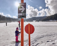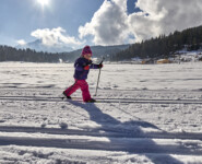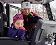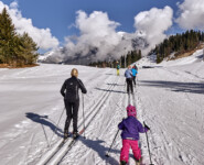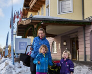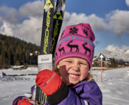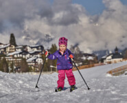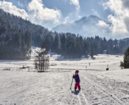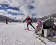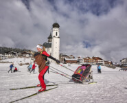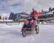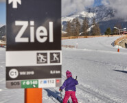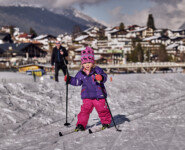 Natürlich sollte man es in so einem Trainingsblock nicht übertreiben also erkunden wir am Nachmittag den Ort und die Loipen lieber mit dem Kinderwagen. Schließlich ist nichts so wichtig, wie eine gute Regeneration. Mama oder Papa können derweil mit um die 40 Kilo Zusatzgewicht ein paar Runden auf der Wiesenloipe drehen. Mehr wäre dann schon ein WM-würdiges Kraftausdauertraining. Den Abend lassen wir wieder ganz standesgemäß beim „Team-Essen“ ausklingen, wobei für unsere zwei Top-Läuferinnen das wichtigste die Nachspeise ist. „Kriegen wir heute wieder ein Eis?“ Das lässt nicht lange auf sich warten. Schließlich werden Stars gerne mal bevorzugt behandelt. So macht das „Trainingslager“ sichtlich Spaß. Das Zubettgehen fällt heute sehr kurz aus: Kurz vorgelesen, schon sind die Augen zugefallen! Den letzten Trainingstag in Seefeld lassen wir dann entspannt angehen. Unser Team ist wieder pünktlich mit dem ersten Sonnenstrahl bereit und wir stehen sehr bald draußen auf der Loipe. Fangen spielen, Skaten probieren – es ist genug Platz zum Rumtollen und Spaß haben auf den zwei Brettern. Auch der angrenzende Rodelhang wird noch ausprobiert. Mit roten Backen und sichtlich geschafft heißt es Abschied nehmen. Aber wir kommen wieder, keine Frage. Es sind ja schließlich nur noch zwei Jahre bis zur Weltmeisterschaft im Tiroler Winterparadies. Bis dahin kann dann auch die Kleinste auf Ski die Seefelder Loipen erobern. Voller Enthusiasmus stolziert unser Team schließlich aus dem Hotel und winkt „ihren“ Loipen noch einmal zu. Ob alles für WM tauglich befunden wurde? Aber sowas von!