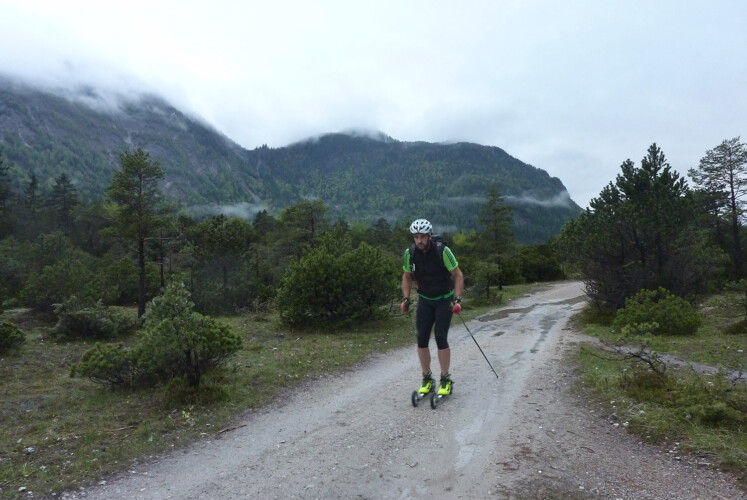 September 2015: Die Sonne scheint über Mittenwald. Gern komme ich zum Klettern, Bergsteigen oder Radfahren in dieser Gegend. Heute bin ich auf andere Art unterwegs. Mit Offroad Rollski geht’s an der Isar entlang nach Vorder- und Hinterriss. Fünfzig Kilometer sind es bis zur Eng-Alm mitten im Karwendelgebirge. Dort schnalle ich die Ski am Rucksack fest und wandere mit einem Kölner Bergsteiger zur Falkenhütte. Die steile Abfahrt am nächsten Morgen zur Ladiz-Alpe ist schwierig, mit luftgefüllten Rädern und zusätzlichen Bremsen aber machbar. In Trailschuhen gehe ich über den kleinen Ahornboden und weiter auf die Hochalm am Karwendelhaus. Oben angekommen setze ich mich auf die Wiese und ruhe aus. Dann gilt es! Ich ziehe die Skischuhe wieder an und drücke sie in die Bindungen. Die Stöcke fasse ich kürzer und fahre, die Ski versetzt und enger zusammen, die ersten Serpentinen der langen Abfahrt. In den Kehren liegt Geröll. Nicht stolpern beim Umtreten! Dann wieder beschleunigen, bremsen, beschleunigen und immer die Vorderräder entlasten! Biker kommen mir entgegen. Freundliche Grüße, einige überraschte Reaktionen. Ihr Respekt für diese Art Bergsport motiviert mich. Mittagspause. Die schöne Landschaft im wilden Karwendeltal ist vielseitig. Mein Blick schweift in die Ferne gen Süden. Hinter den Bergketten liegt die norditalienische Tiefebene. In Gedanken rolle ich durchs Gebirge auf schönen Wegen und über niedrige Pässe. Eine Rollski-Tour über die Alpen, das könnte mir gefallen. Mit Rucksack unterwegs auf festen Wegen über Berg und Tal. Oder gar im hochalpinen Gelände das nahezu Unmögliche versuchen …? Beflügelt von solchen Ideen sause ich in schneller Fahrt über den Talboden. Den steinigen Gegenanstieg nehme ich mit vollem Einsatz, meist im Doppelstockschub. Noch einmal steil bergab. Aufgepasst bei der letzten Stufe. In Scharnitz treffe ich wieder auf die Isar.