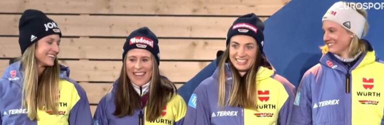Siegerehrung der deutschen Langlauf Staffeln auf der Medal Plaza in Kranjska Gora