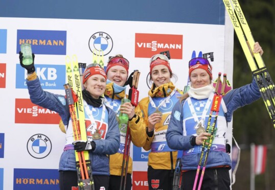 In einem kuriosen Rennen gewinnt die deutsche Damenstaffel Bronze hinter Frankreich und Schweden. Sophia Schneider erfuhr erst am Vormittag von ihrem Einsatz und vermied im entscheidenden Anschlag, wo rings um sie Strafrunden geschossen wurden, mit dem letzten Nachlader die Extrarunde und brachte die Staffel nach insgesamt neun Nachladern auf dem Bronzerang ins Ziel…