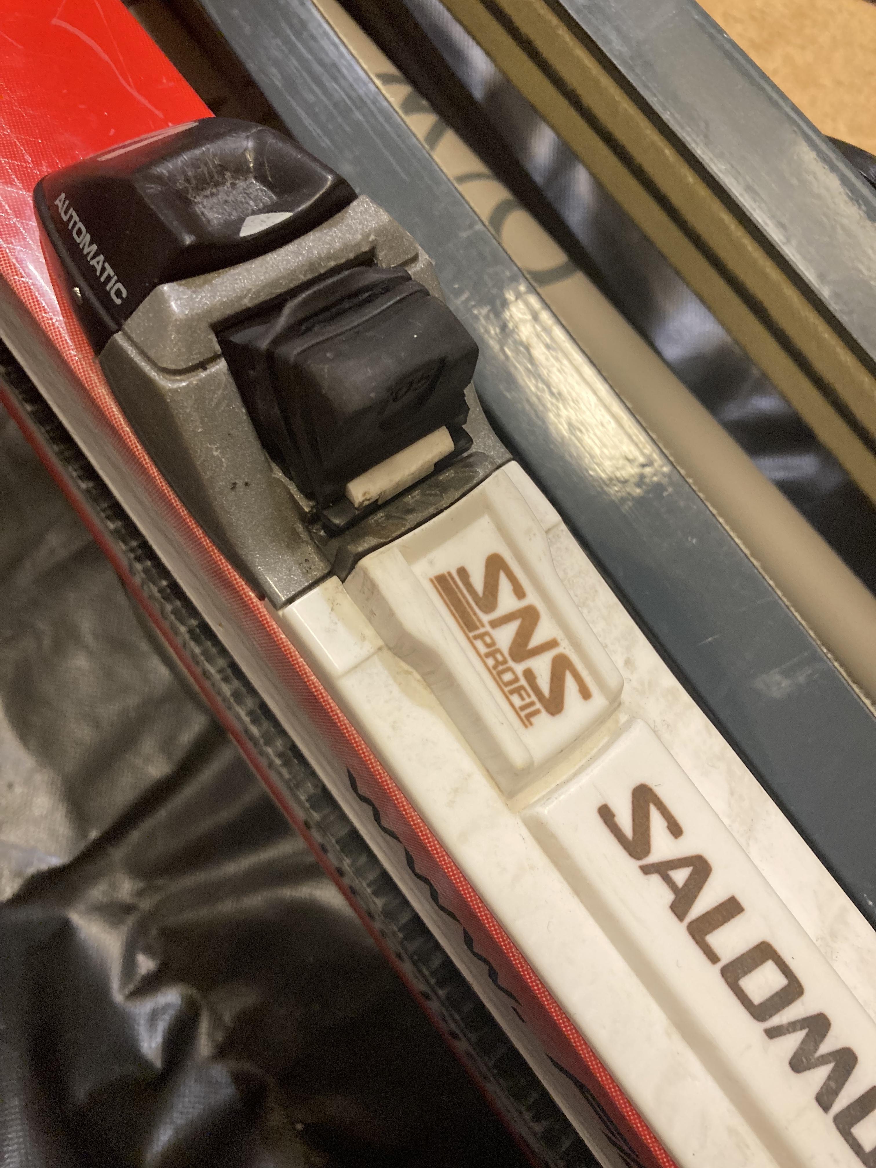 Die Ski sind alt, aber zu den ganz alten dürften sie (glaube ich) nicht zählen. Jedenfalls gibt es sogar in der Bindungsplatte einen Spalt, der ja eigentlich für den zweiten Steg der Pilot-Schuhe vorgesehen ist. Der Steg passt aber um 3-5mm nicht in den Spalt hinein – warum auch immer…