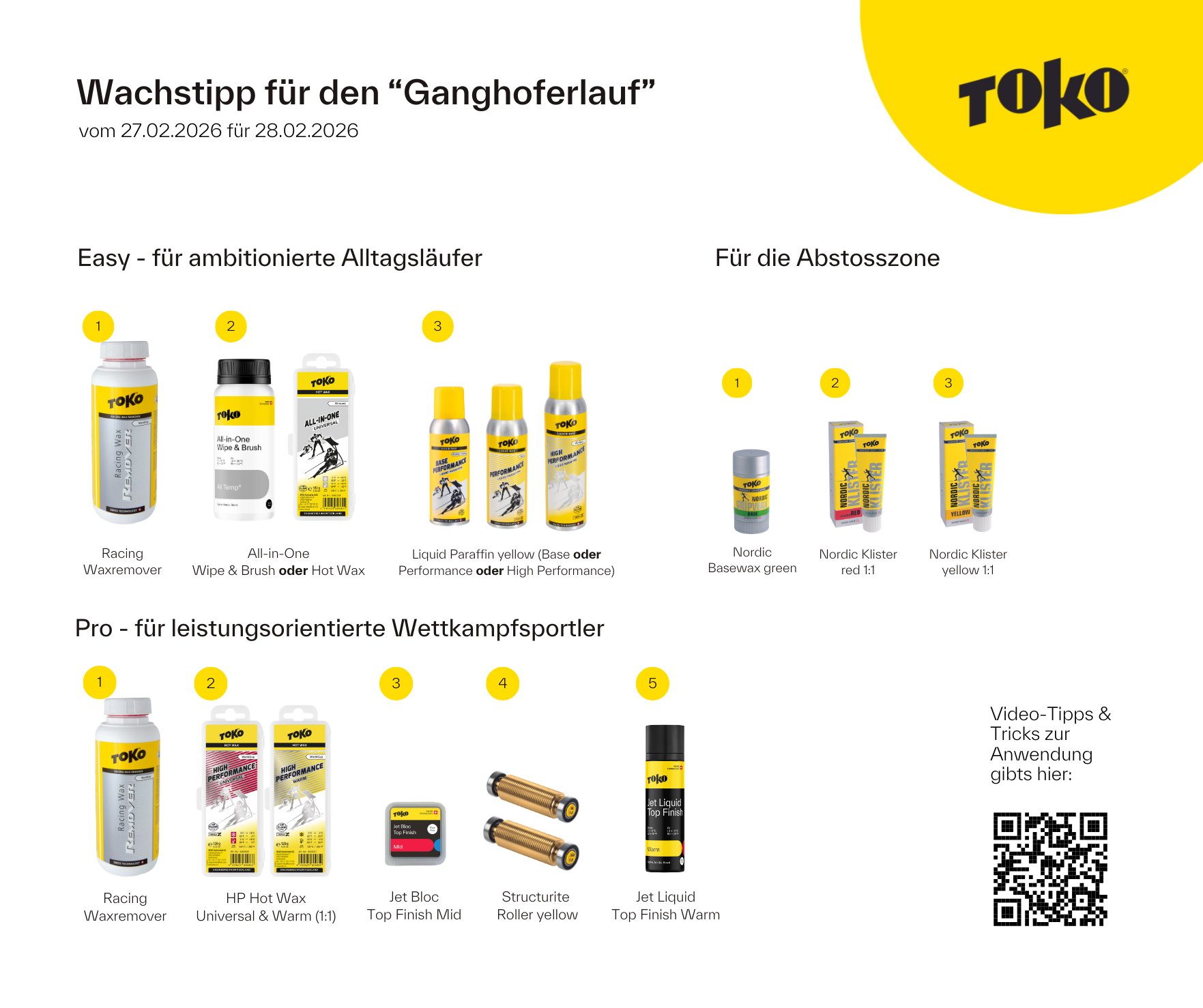 Luka KevricTeilnehmerEndlich wieder KLL! Unsere Wachs-Experten sind vor Ort beim König Ludwig Lauf in Oberammergau und haben die aktuellen Bedingungen direkt auf der Strecke getestet. Der Wachstipp im Anhang bietet die ideale Balance aus Gleitfähigkeit und Kontrolle für die morgigen Verhältnisse. Dank der frischen Einschätzung vom Renntag seid ihr optimal vorbereitet. Bei detaillierten Fragen besucht einfach unsere Experten vor Ort oder holt euch alle sonstigen Informationen hier über den Service vor Ort hier: https://www.koenig-ludwig-lauf.com/wachstipp-by-toko.html