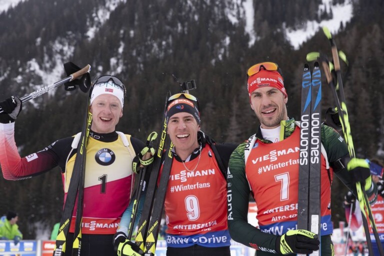 27.01.2019, Johannes Thingnes Boe (NOR), Quentin Fillon Maillet (FRA), Arnd Peiffer (GER), (l-r) © Manzoni/NordicFocus