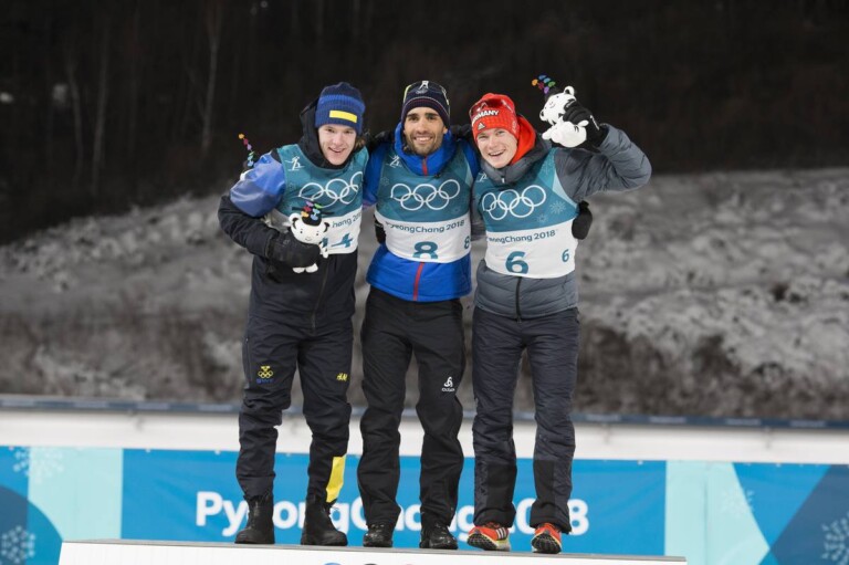 Sebastian Samuelsson (SWE), Martin Fourcade (FRA), Benedikt Doll (GER), (l-r) © Manzoni/NordicFocus