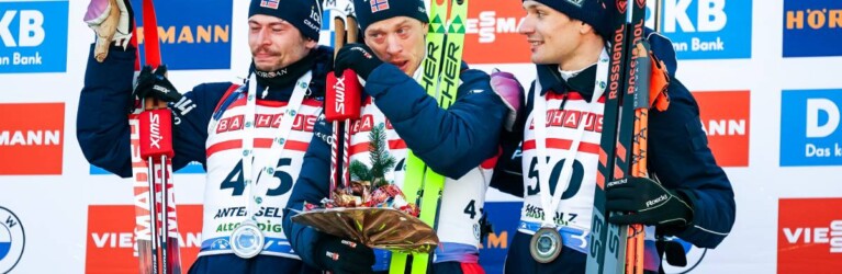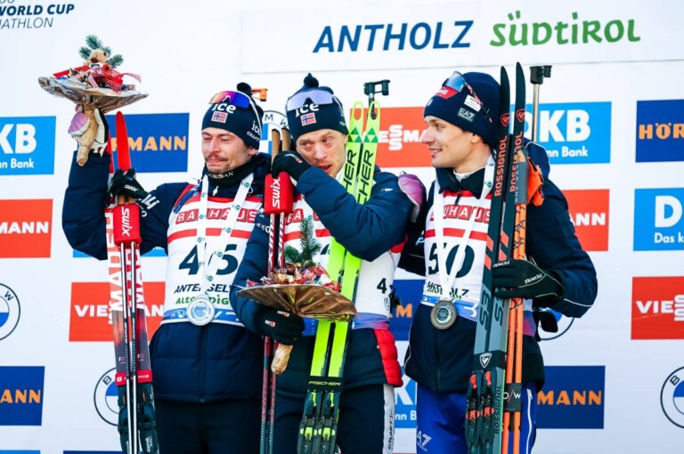 Sturla Holm Laegreid (NOR), Tarjei Boe (NOR), Tommaso Giacomel (ITA), (l-r) © Thibaut/NordicFocus