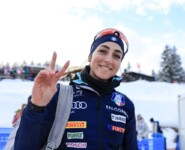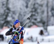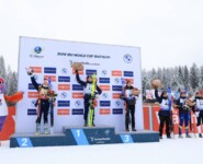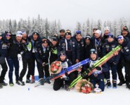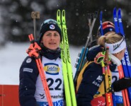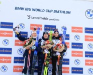 Cyril Burdet (FRA), coach Team France, Stephane Bouthiaux (FRA) coach Team France, Lionel Laurent (FRA), media coordinator Team France, Julia Simon (FRA), Justine Braisaz-Bouchet (FRA), Jean-Pierre Amat (FRA), Olympic Champion and shooting coach Team France, Jean Paul Giachino (FRA), Sophie Chauveau (FRA), Gilonne Guigonnat (FRA), Chloe Chevalier (FRA), (l-r) © Manzoni/NordicFocus