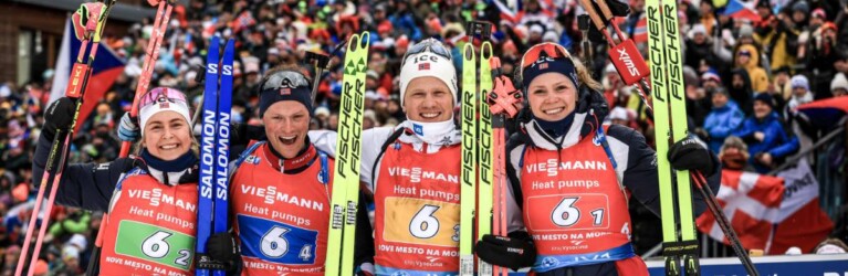 Ingrid Landmark Tandrevold (NOR), Endre Stroemsheim (NOR), Johannes Dale (NOR), Karoline Offigstad Knotten (NOR), (l-r) - Bildergalerie Biathlon IBU Weltcup, Nove Mesto (CZE), Mixed Staffel - xc-ski.de Langlauf