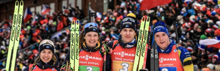 Anna Magnusson (SWE), Hanna Oeberg (SWE), Martin Ponsiluoma (SWE), Sebastian Samuelsson (SWE), (l-r) - Bildergalerie Biathlon IBU Weltcup, Nove Mesto (CZE), Mixed Staffel - xc-ski.de Langlauf