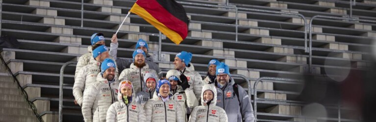 The german team celebrates on the empty grand stand © Manzoni/NordicFocus