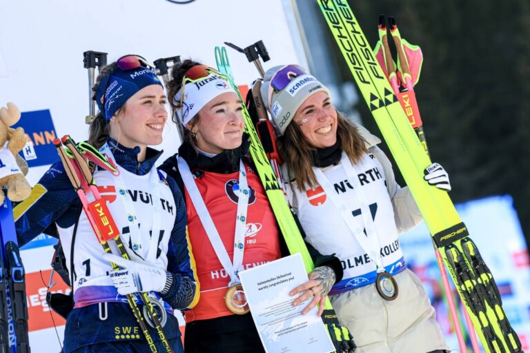 Elvira Oeberg (SWE), Lou Jeanmonnot (FRA), Lena Haecki-Gross (SUI), (l-r) © Manzoni/NordicFocus