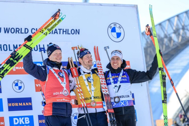 Johannes Thingnes Boe (NOR), Sturla Holm Laegreid (NOR), Quentin Fillon Maillet (FRA), (l-r) © Manzoni/NordicFocus