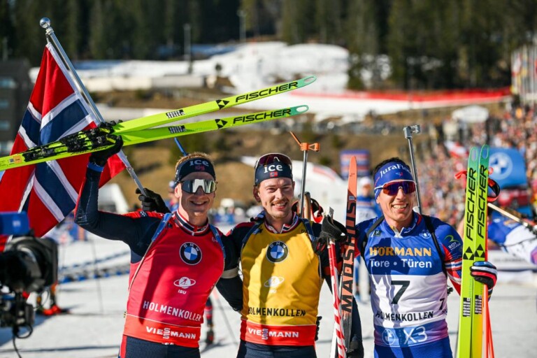 Johannes Thingnes Boe (NOR), Sturla Holm Laegreid (NOR), Quentin Fillon Maillet (FRA), (l-r) © Authamayou/NordicFocus