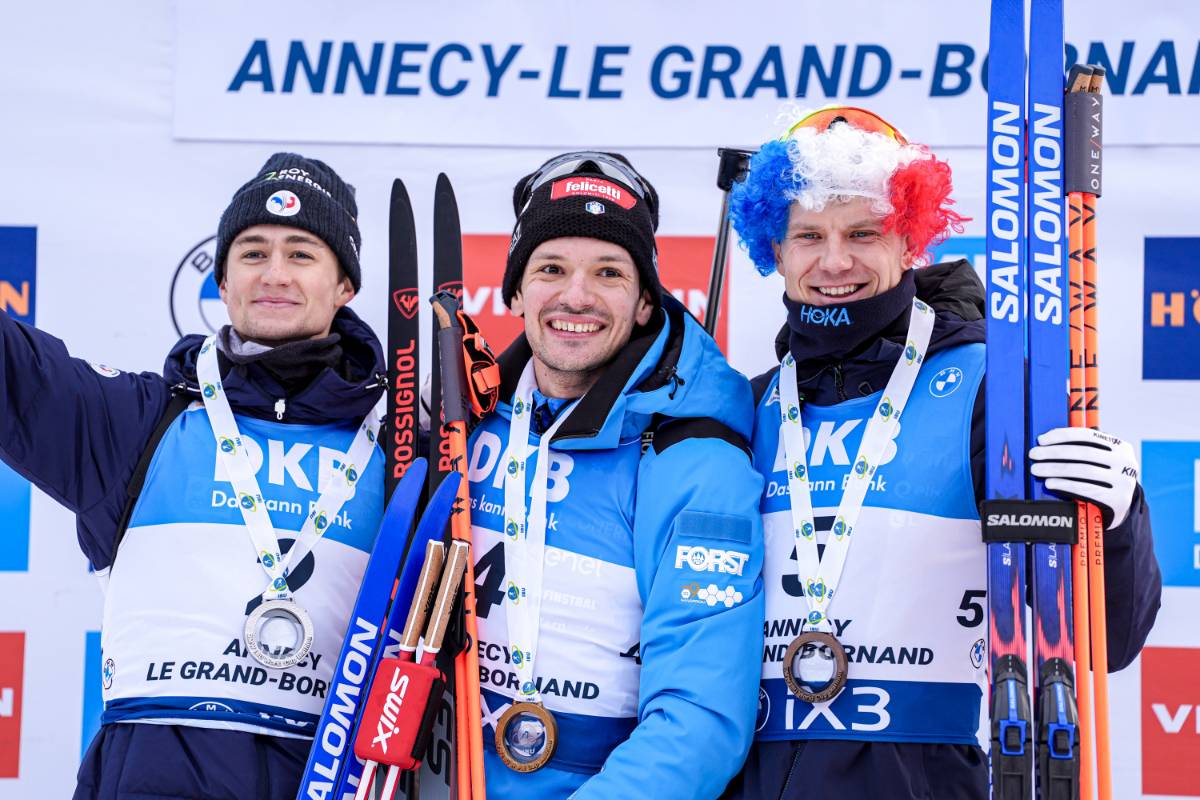 Eric Perrot (FRA), Tommaso Giacomel (ITA), Vetle Sjaastad Christiansen (NOR), (l-r) © Thibaut/NordicFocus