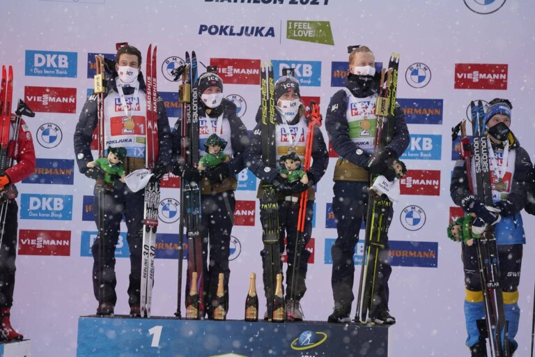 Sturla Holm Laegreid (NOR), Marte Olsbu Roeiseland (NOR), Tiril Eckhoff (NOR), Johannes Thingnes Boe (NOR), (l-r) © Thibaut/NordicFocus