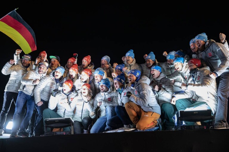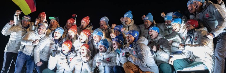 20.02.2020, Antholz, Italy (ITA): Mark Kirchner (GER) coach Team Germany, Arnd Peiffer (GER), Benedikt Doll (GER), Johannes Kuehn (GER), Denise Herrmann (GER), Philipp Nawrath (GER), Janina Hettich (GER), Vanessa Hinz (GER), Erik Lesser (GER), (l-r) © Manzoni/NordicFocus