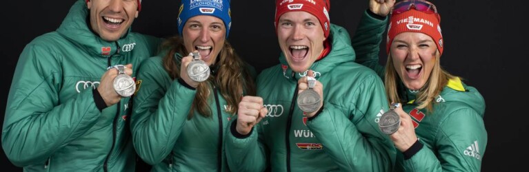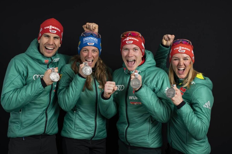 07.03.2019, Oestersund, Sweden (SWE): Arnd Peiffer (GER), Vanessa Hinz (GER), Benedikt Doll (GER), Denise Herrmann (GER), (l-r) © Manzoni/NordicFocus