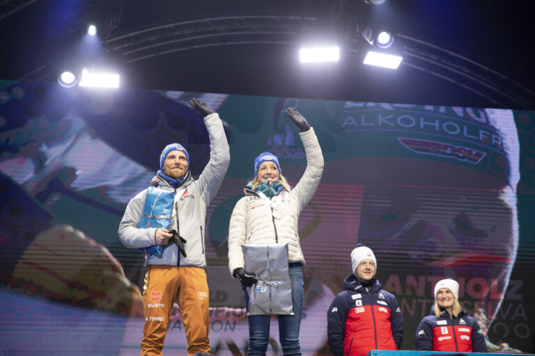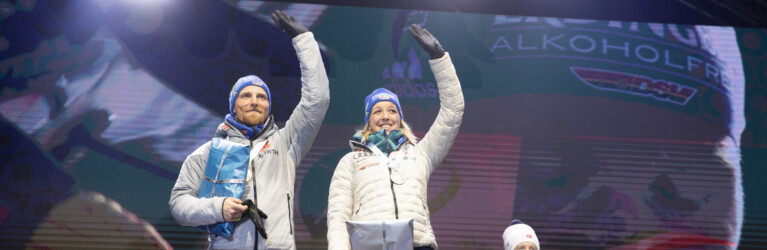 Erik Lesser (GER), Franziska Preuss (GER), (l-r) - IBU world championships biathlon, medals, Antholz (ITA). www.nordicfocus.com. © Manzoni/NordicFocus. Every downloaded picture is fee-liable. © Manzoni/NordicFocus