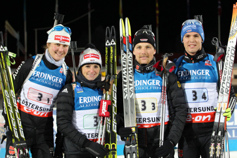 Tina Bachmann (GER), Fischer, Rottefella, OneWay, adidas, Andrea Henkel (GER), Fischer, Rottefella, Swix, adidas, Toko, Eric Lesser (GER), Salomon, Swix, adidas, Simon Schempp (GER), Rossignol, Rottefella, Swix, adidas - IBU world cup biathlon, relay mixed, Oestersund (SWE). www.nordicfocus.com. © Manzoni/NordicFocus. Every downloaded picture is fee-liable. © NordicFocus