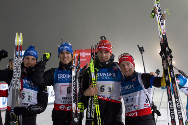 L-R: Eric Lesser (GER), Salomon, Swix, adidas, Simon Schempp (GER), Rossignol, Rottefella, Swix, adidas , Arnd Peiffer (GER), Fischer, Salomon, OneWay, adidas, Florian Graf (GER), Rossignol, Rottefella, Leki, adidas - IBU world cup biathlon, relay men, Oberhof (GER). www.nordicfocus.com. © Manzoni/NordicFocus. Every downloaded picture is fee-liable. © NordicFocus