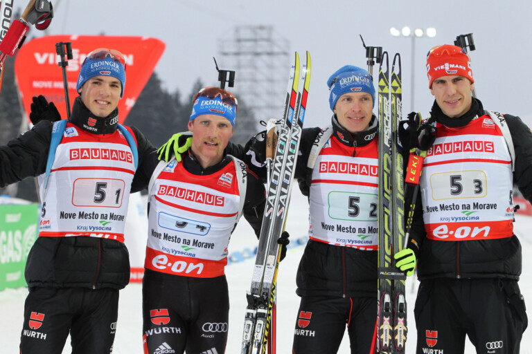 L-R: Simon Schempp (GER), Rossignol, Rottefella, Swix, adidas , Eric Lesser (GER), Salomon, Swix, adidas, Andreas Birnbacher (GER), Fischer, Rottefella, Alpina, Leki, adidas, Arnd Peiffer (GER), Fischer, Salomon, OneWay, adidas - IBU world championships biathlon, relay men, Nove Mesto (CZE). www.nordicfocus.com. © Manzoni/NordicFocus. Every downloaded picture is fee-liable. © NordicFocus