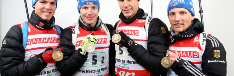 L-R: Simon Schempp (GER), Rossignol, Rottefella, Swix, adidas , Andreas Birnbacher (GER), Fischer, Rottefella, Alpina, Leki, adidas, Arnd Peiffer (GER), Fischer, Salomon, OneWay, adidas, Eric Lesser (GER), Salomon, Swix, adidas - IBU world championships biathlon, medals, Nove Mesto (CZE). www.nordicfocus.com. © Manzoni/NordicFocus. Every downloaded picture is fee-liable. © NordicFocus