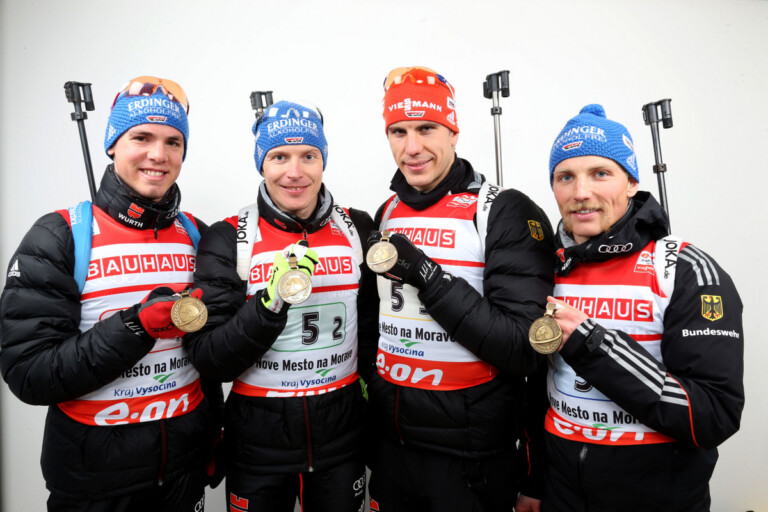 L-R: Simon Schempp (GER), Rossignol, Rottefella, Swix, adidas , Andreas Birnbacher (GER), Fischer, Rottefella, Alpina, Leki, adidas, Arnd Peiffer (GER), Fischer, Salomon, OneWay, adidas, Eric Lesser (GER), Salomon, Swix, adidas - IBU world championships biathlon, medals, Nove Mesto (CZE). www.nordicfocus.com. © Manzoni/NordicFocus. Every downloaded picture is fee-liable. © NordicFocus
