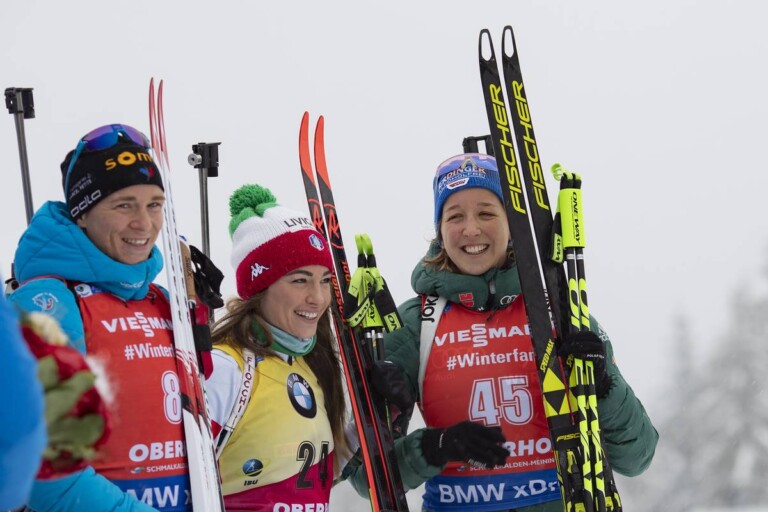 Anais Bescond (FRA), Dorothea Wierer (ITA), Franziska Preuss (GER), (l-r) © Manzoni/NordicFocus