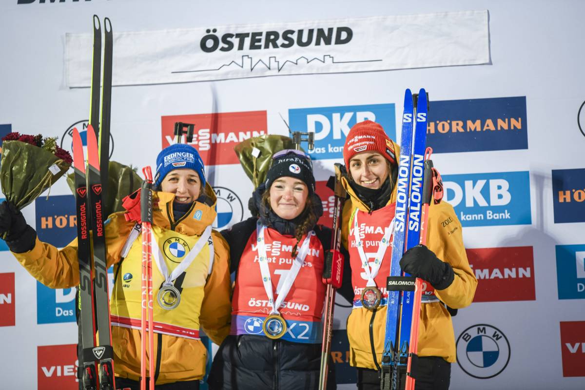 Franziska Preuss (GER), Lou Jeanmonnot (FRA), Vanessa Voigt (GER), (l-r) © Authamayou/NordicFocus