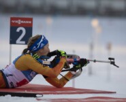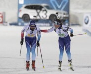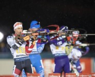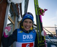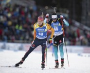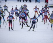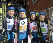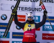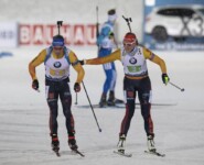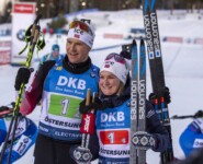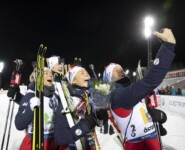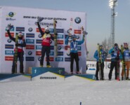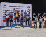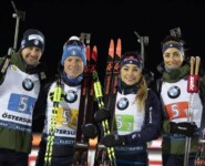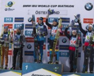 Die Sieger der ersten Single-Mixed-Staffel der Saison - Sebastian Samuelsson (SWE), Hanna Oeberg (SWE) - Platz 2: Franziska Preuss (GER), Erik Lesser (GER) - Platz 3: Marte Olsbu Roeiseland (NOR), Vetle Sjaastad Christiansen (NOR) © Nico Manzoni/NordicFocus