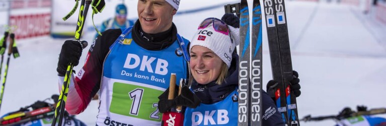Das Team aus Norwegen - Vetle Sjaastad Christiansen (NOR), Marte Olsbu Roeiseland (NOR) - freut sich über Bronze © Nico Manzoni/NordicFocus