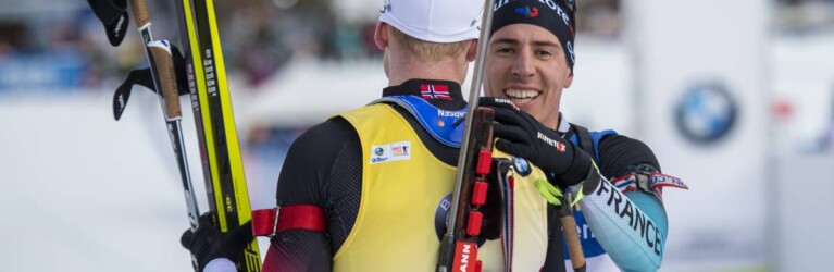 Quentin Fillon Maillet (FRA) wird mit vier fehlerfreien Schießeinalgen mit 22,0 Sek. Rückstand Zweiter in der Verfolgung hinter dem Seriensieger Johannes Thingnes Boe (NOR). © Thibaut/NordicFocus