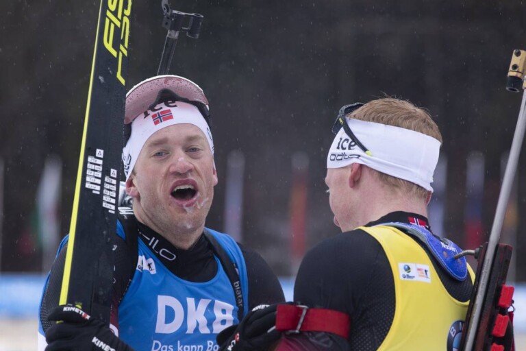Das Brüderpaar Tarjei Boe (NOR), Johannes Thingnes Boe (NOR), (l-r) erneut gemeinsam auf dem Podest. J. T. Boe siegt im Massenstart und Tarjei Boe läuft auf Rang 3. © Manzoni/NordicFocus