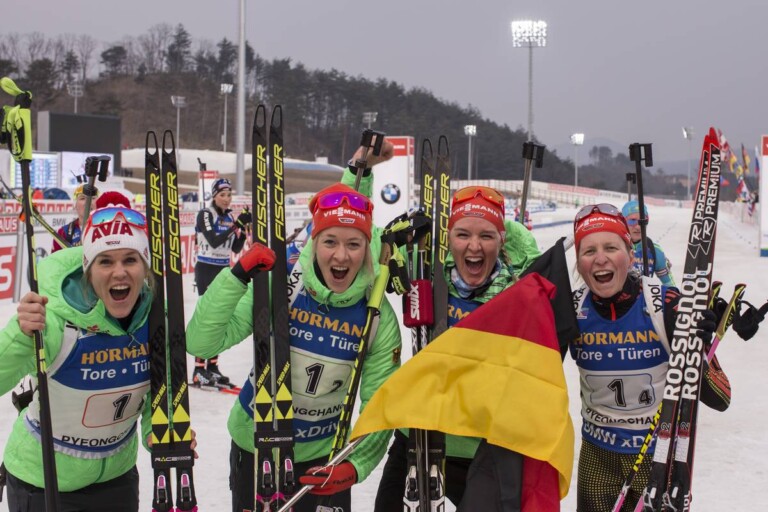 Nadine Horchler (GER), Maren Hammerschmidt (GER), Denise Herrmann (GER), Franziska Hildebrand (GER), (l-r) - IBU world cup biathlon, relay women, Pyeong Chang (KOR). © Manzoni/NordicFocus
