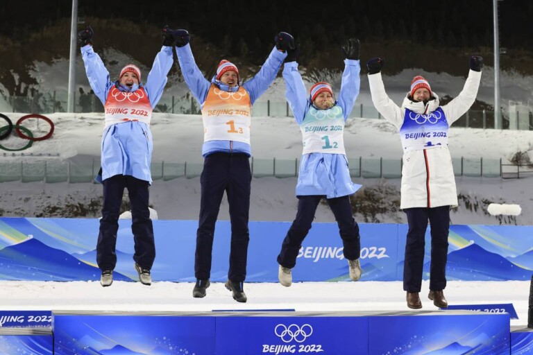 05.02.2022, Beijing, China (CHN): Marte Olsbu Roeiseland (NOR), Tarjei Boe (NOR), Tiril Eckhoff (NOR), Johannes Thingnes Boe (NOR), (l-r) © Manzoni/NordicFocus