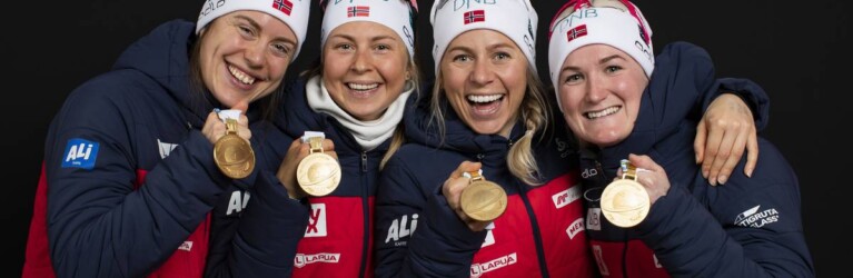 16.03.2019, Oestersund, Sweden (SWE): Synnoeve Solemdal (NOR), Ingrid Landmark Tandrevold (NOR), Tiril Eckhoff (NOR), Marte Olsbu Roeiseland (NOR), (l-r) © Manzoni/NordicFocus