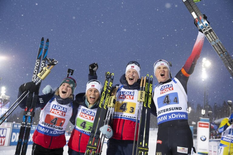 07.03.2019, Oestersund, Sweden (SWE): Marte Olsbu Roeiseland (NOR), Tiril Eckhoff (NOR), Johannes Thingnes Boe (NOR), Vetle Sjaastad Christiansen (NOR), (l-r) © Manzoni/NordicFocus