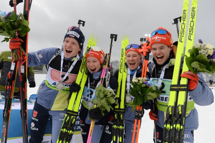 Startläufer Lucas Fratzscher benötigte liegend zwei Nachlader und kassierte im stehenden Anschlag eine Extrarunde. An siebter Position mit 44,7 Sek. Rückstand schickte er Philipp Horn ins Rennen, während Norwegen vor Finnland und Slowenien führten. Im liegenden Anschlag musste Horn ebenfalls zwei Mal nachladen, kam aber stehend mit einem Nachlader aus und wechselte mit nur 4,4 Sek. Rückstand an zweiter Position hinter Norwegen auf Janina Hettich. Bei diesem Wechsel waren bereits neun Staffeln wegen Überrundung aus dem Rennen geschieden. Janina Hettich und auch die Norwegerin Jenny Enodd blieben im liegenden Anschlag ohne Fehler und verließen den Schießstand gemeinsam. Auf der dritten Position lag zu diesem Zeitpunkt Rumänien, allerdings bereits mit einem Rückstand von über einer Minute. Im stehenden Anschlag schossen Hettich und die Norwegerin unisono und nach drei Nachladern blieb bei beiden eine Scheibe schwarz. Zeitgleich kamen sie aus der Strafrunde und weiterhin Rumänien eine gute Minute dahinter auf dem dritten Rang. Nun lag es an den Schlussläuferinnen, wer sich am Ende den Titel holt und wer auf dem Silberrang landet. Nach dem liegenden Anschlag hatte sich Sophia Schneider mit fehlerfreiem Schießen einen kleinen Vorsprung erarbeitet und kam mit 6,9 Sek. Vorsprung zum entscheidenden Anschlag. Femsteinevik kam mit einem Nachlader durch und bei Sophia Schneider fiel die letzte Scheibe erst mit dem zweiten Nachlader. Erst hatte es den Anschein, dass die Deutsche ausgestattet mit perfekt präpariertem Material näher an die Norwegerin herankam, aber am Ende reichte es doch nicht ganz und Schneider ließ die Norwegerin ziehen.