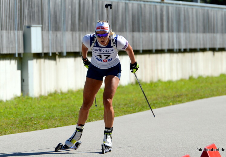 Starteten beim Super-Sprint noch 16 deutsche Damen, waren es beim heutigen Massenstart nur mehr sechs. Das schweizerische Damenteam trat erneut komplett an und auch sechs der seit dieser Saison von Gerald Hönig trainierten Österreicherinnen gingen ins Rennen. Hönig befindet sich mit seinem Team ebenfalls zu einem Vorbereitungslehrgang in der Chiemgau-Arena. Im Massenstart musste die 2-km-Runde fünf mal gelaufen und dazwischen zwei Mal liegend und zwei Mal stehend geschossen werden. Denise Herrmann war wie tags zuvor Schnellste auf den Skirollern und nach insgesamt drei Strafrunden (2:0:0:1) ging der Sieg mit einer Gesamtzeit von 29:10,0 Min. an sie gefolgt von den beiden Schweizerinnen Aita und Elisa Gasparin. Janina Hettich aus dem DSV-Team (0:1:0:1; 29:53,0 Min.) belegte Rang vier. Hanna Kebinger (1:0:1:0) wurde Siebte, Marion Deigentesch (2:0:1:0) Achte, Marina Sauter 14. (0:1:1:0) und Maren Hammerschmidt 18. (3:2:1:0). Beste Österreicherin wurde Dunja Zdouc (1:0:0:1) auf Rang fünf gefolgt von Lisa Hauser (3:0:0:2). Bereits nächste Woche finden in Altenberg die Deutschen Biathlonmeisterschaften statt, allerdings bei den Damen ohne Karolin Horchler, Vanessa Hinz und Vanessa Voigt, die verletzungsbedingt pausieren müssen.