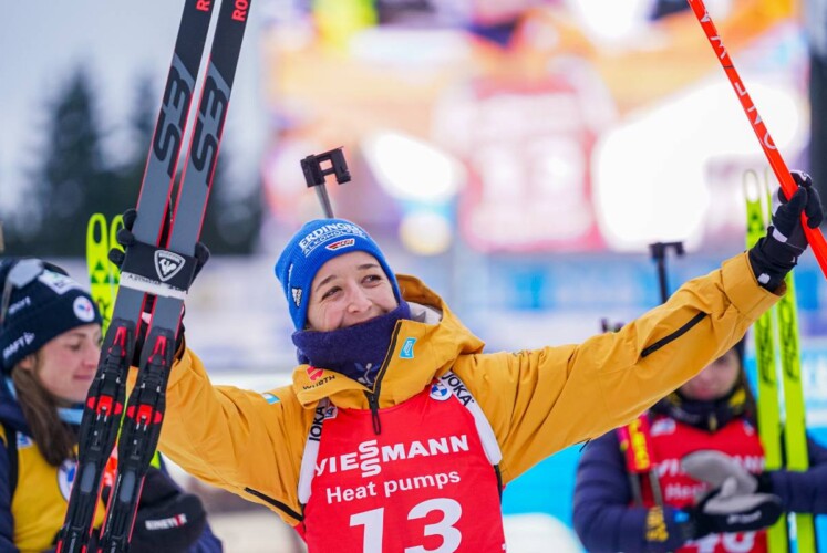 Insbesondere die drei Deutschen aus der ersten Startgruppe legten einen starken Einstieg hin. Janina Hettich-Walz, Franziska Preuß und auch Vanessa Voigt, alle drei hielten sich liegend schadlos und waren vorne mit dabei, nachdem zuvor viele Fehler auch von Mitfavoritinnen, geschossen wurden. Hettich-Walz kam als erste zum Stehendanschlag, räumte sicher ab und Franziska Preuß machte es ihr in schnellem Rhythmus nach und setzte sich vor Hettich-Walz an die Spitze. Auch Vanessa Voigt traf kurze Zeit später stehend alle Scheiben, war in der Spur nicht ganz so schnell und reihte sich hinter ihren Teamkolleginnen ein. Hettich-Walz übernahm im Ziel die Führung, wurde aber mit 19,4 Sek. Vorsprung von Franziska Preuß verdrängt. Ab da hieß es warten, was die erbrachte Leistung wert ist. Die Führung hielt nur bis zum Eintreffen der derzeitigen Gesamtweltcupführenden Justine Braisaz-Bouchet. Nach zwei Strafrunden hat sie den beiden Deutschen auf der Schlussrunde 28,5 Sek. abgenommen und sich an die Spitze gelaufen. Ingrid Landmark Tandrevold, die Trägerin des roten Trikots, war nach drei Extrarunden aus dem stehenden Anschlag bereits aus dem Rennen für eine vordere Platzierung. Das rote Trikot für die Führung in der Sprintwertung muss sie an Justine Braisaz-Bouchet abgeben. Erneut spannend wurde es als die Schwedin Anna Magnusson und die Französin Sophie Chauveau Angriff auf den Silberrang von Franziska Preuß nahmen. Die Französin kam 0,2 Sek. hinter Preuß ins Ziel und auch Magnusson kam nicht an Preuß vorbei. Beide überquerten das Ziel aber vor Janina Hettich-Walz. „Ich habe versucht sehr konzentriert zu arbeiten, weil immer wieder mal Wind reinkommt und ich bin happy, dass alle Scheiben gefallen sind. Stehend hatte ich keinen Wind, vielleicht hatte ich da einfach Glück,“ meinte sie nach dem Rennen. Vanessa Voigt wurde 13. und mit 53,2 Sek. Rückstand wird sie in die Verfolgung starten. „Ich habe schon beim Anschießen gemerkt, dass ich ziemlich unruhig bin. Ich habe mich so sehr gefreut auf diesen Heimweltcup, mein Ziel war es mit den Zuschauern zu laufen, aber es ist mir nicht ganz gut gelungen,“ so die Thüringerin Voigt.