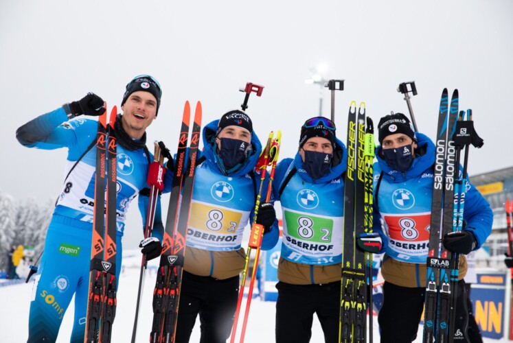 „Wir müssen uns auf uns selbst konzentrieren“ – und nicht auf die übermächtigen Norweger, meinte Arnd Peiffer vor dem Rennen. Das war auch definitiv die richtige Devise, auch wenn man nicht erwarten konnte, dass die Norweger der Spitze lange Zeit hinterherliefen. Der zweite Norweger Johannes Dale, eigentlich ein extrem sicherer Liegendschütze, hatte ausgerechnet dabei große Schwierigkeiten. Trotz wenig Wind drehte er nach Fehlschüssen verunsichert am Diopter und muss dennoch in die Strafrunde. Diesem Rückstand, den er durch viel Verkehr zunächst nicht nennenswert verringern konnte, lief auch Tarjei Bø weiter hinterher, auch wenn Dale sein Team bis zur Halbzeit bis auf Platz vier nach vorn brachte. Vorne sah lange Zeit alles nach einem deutschen Heimsieg aus, bis gegen Ende Emilien Jacquelin seinem Team den Sieg brachte, nachdem er die letzten beiden Staffeln verschossen hatte. Nach dem erfolgreichen Stehendschießen stahl sich ein Lächeln auf das Gesicht des Franzosen, das während der gesamten Schlussrunde blieb, obwohl Johannes Thingnes Bø nach dem Stehendschießen den norwegischen Rückstand von 55 Sekunden beim Wechsel auf 23 Sekunden reduziert hatte. Dennoch konnte der Norweger seinen französischen Konkurrenten aus der Ferne nur beim Jubeln beobachten zusammen mit Simon Desthieux, Quentin Fillon Maillet und Fabien Claude. Vetle Sjåstad Christiansen, Johannes Dale, Tarjei und Johannes Thingnes Bø wurden diesmal nur Zweite vor den starken Italienern. Dass sie in der ersten Rennhälfte durch Thomas Bormolini und Lukas Hofer mithalten, war definitiv zu erwarten. Fraglich war jedoch die Leistung des noch relativ weltcupunerfahrenen Tommaso Giacomel und des formschwachen Dominik Windisch, der hier letztes Jahr in einer Abfahrt schwer stürzte und in dieser Saison viele Rückenbeschwerden mit schmerzhaften Wirbelblockaden hat. Doch der 20-jährige Giacomel schlug sich beachtlich: Er ging seine erste Runde sehr schnell an, leistete sich aber dennoch nur zwei Nachlader liegend und blieb stehend fehlerfrei. Obwohl er in der letzten Runde einbrach, konnte er als Dritter auf Windisch übergeben. Dieser musste zwar auch nur zweimal nachladen und büßte auf der Schlussrunde ebenfalls noch ein, konnte wegen der großen Abstände aber den Podestplatz ins Ziel bringen.